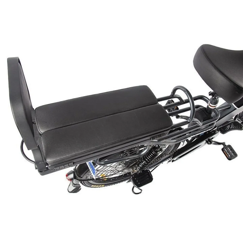 Усовершенствованная модель дополнительно оснащена задними пружинными амортизаторами, чтобы не доставлять дискомфорт при перевозке пассажира или груза на заднем сидении. Рама электровелосипеда изготовлена из стали повышенной прочности, а общая нагрузка на велогибрид не должна превышать 130 кг.