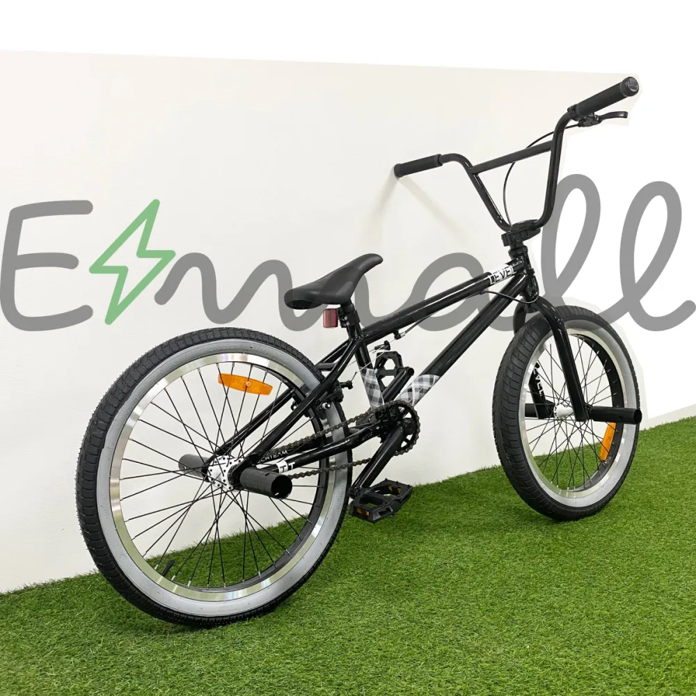 Надежная колесная часть на двойных алюминиевых ободах с накатистой резиной, брендовые покрышки, TT стальной 700 мм руль в сочетании с 4 пегами позволяют ставить трюки по рейлам и делать более серьезные манипуляции.